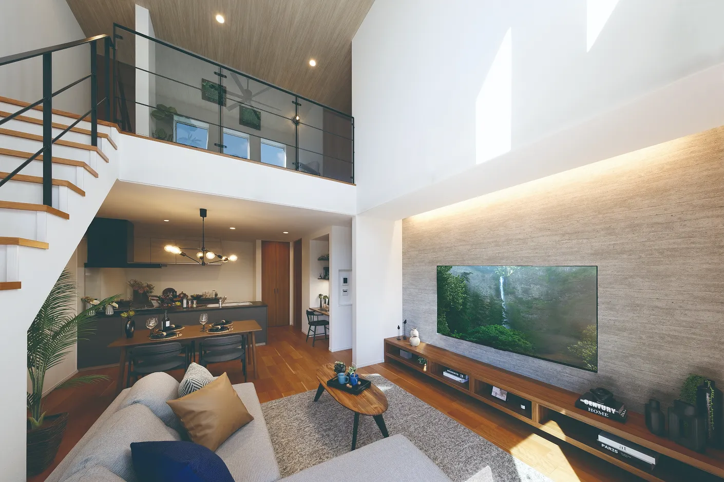 大きな吹抜けが自慢の伸びやかなリビング空間。