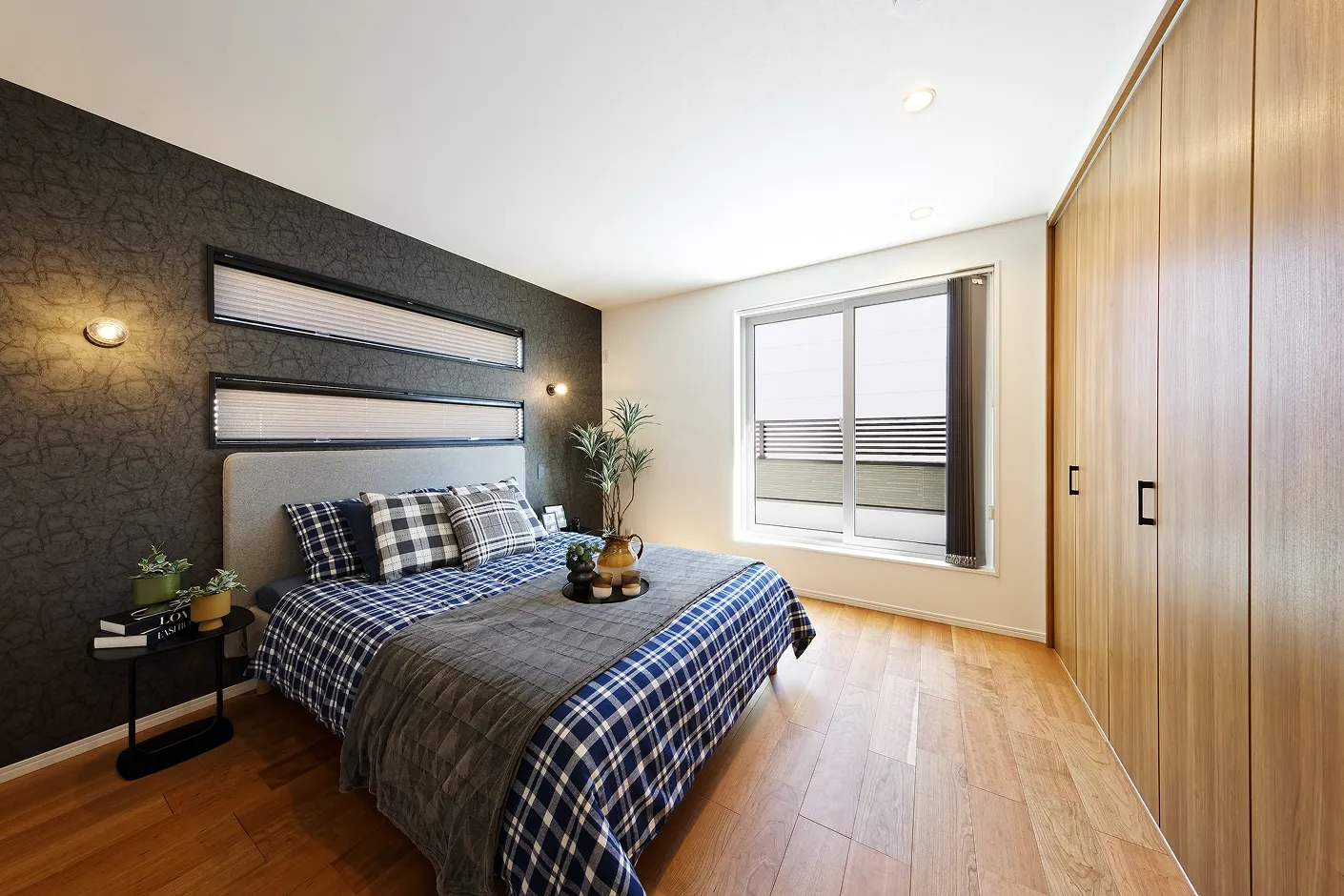 バルコニーからの明るい陽光が入る7.5帖の広々とした主寝室。