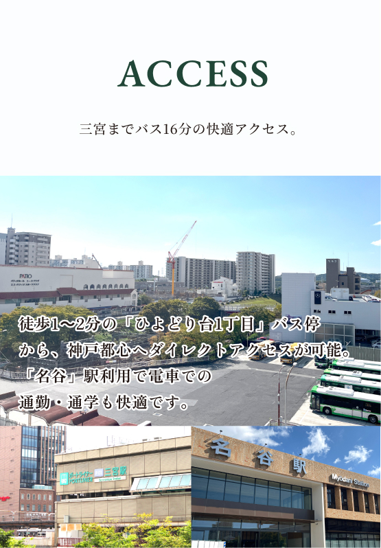 徒歩1~2分の「ひよどり台1丁目」バス停から、神戸都心へダイレクトアクセスが可能。「名谷」駅利用で電車での通勤・通学も快適です。