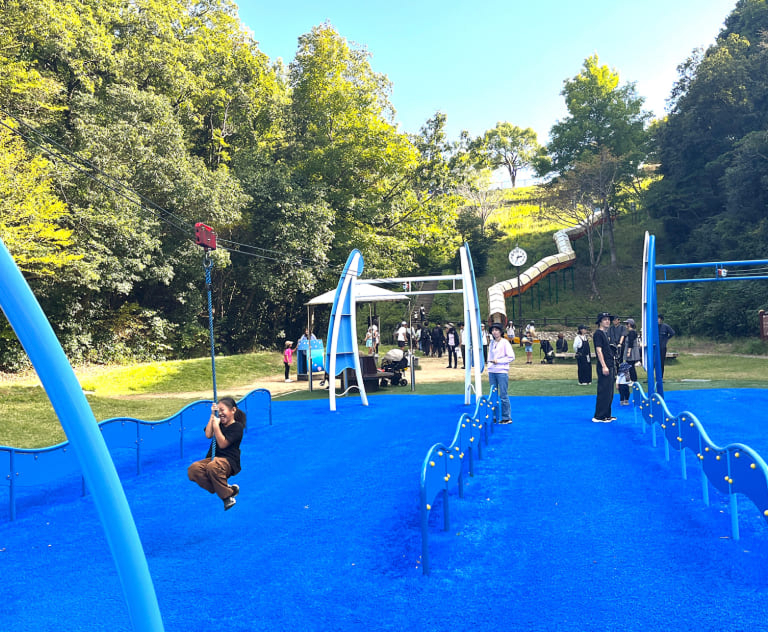 お子様に大人気のロングスライダーを滑って降りると現れる、無料で遊べるアスレチック広場「トリム園地」。イカダやスライダー、フィールドアスレチック等、家族みんなで時間を忘れて楽しめるおすすめエリア。夏期には水遊びができる噴水エリアも人気です。