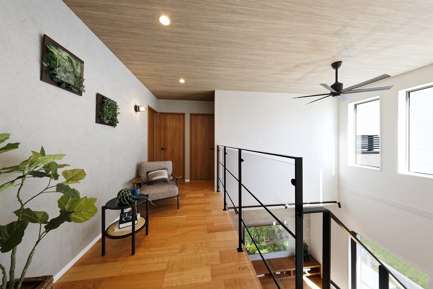 本棚や椅子を設けて家族共有のくつろぎスペースにするなど多彩な用途が楽しいファミリーホール。